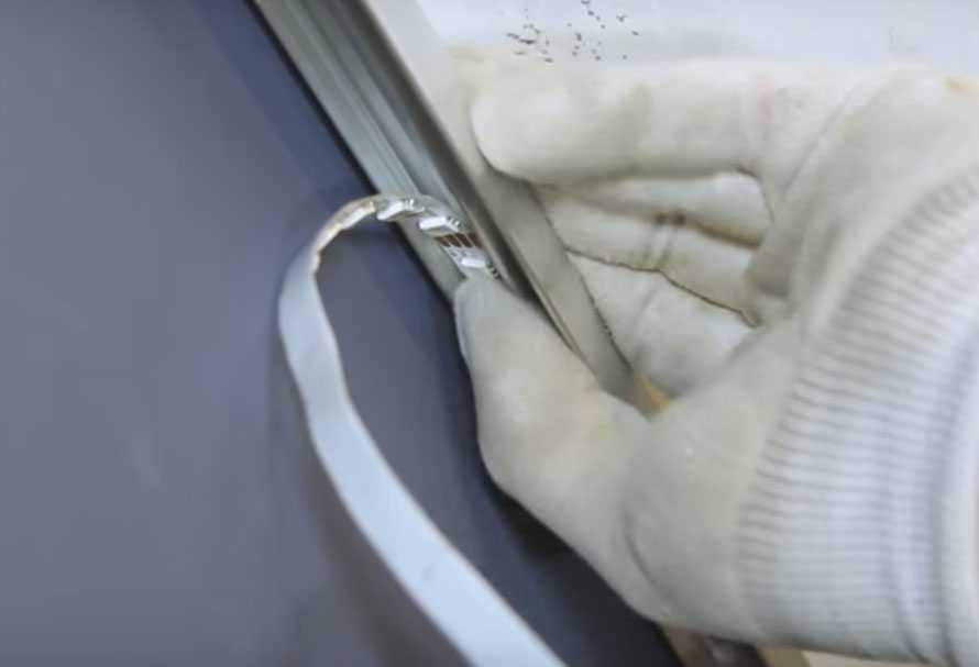 Следующий этап — монтаж светодиодной ленты. Край полосы оставляют над профилем, остальное вставляют в паз и защёлкивают. Клей не требуется.