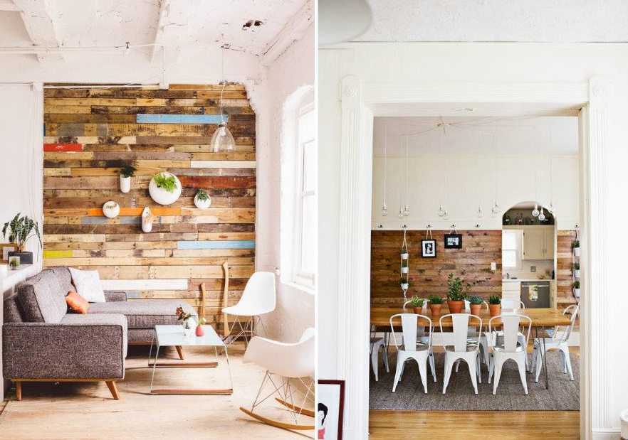 Дизайнеры не советуют полностью заделывать материалом все стены. Такой вариант больше подходит для загородных дач и гостевых домиков. Чаще этот материал применяется для выделения части комнаты, например, зонирования или создания акцентного полотна. Рассмотрим, как выглядит ламинат на стенах разных помещений.