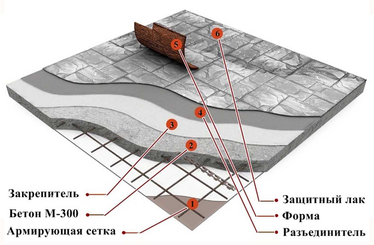 Декоративные покрытия могут выполняться как по земляным, так и по готовым бетонным поверхностям. Выбор толщины и внешнего вида будущего покрытия зависит от предпочтений и эксплуатационных требований застройщика.