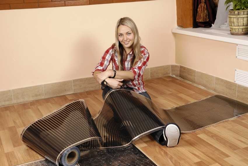 Между ламинированным покрытием и ИК теплым полом надо настелить полиэтиленовую пленку или гидроизоляционный материал. Отрезы надо укладывать внахлест и проклеивать между собой скотчем. Это необходимо для обеспечения безопасности эксплуатации теплого пола и обеспечения защиты от повреждений и избыточной влажности.