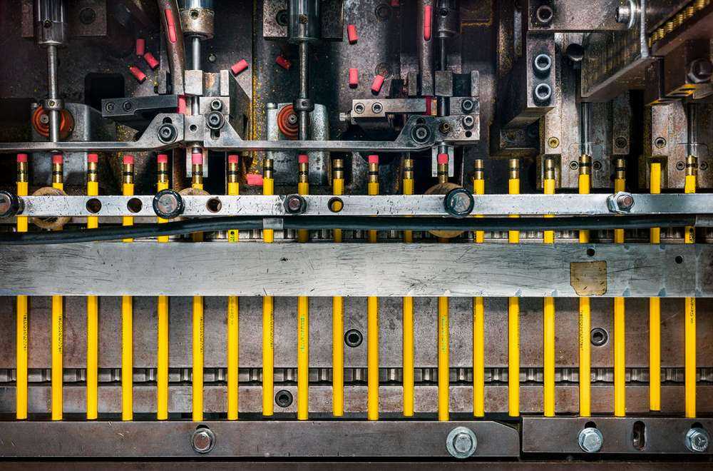 Осталось доделать торцы, они несколько раз окунаются в специальный состав, это делается не вручную, а на оборудовании. Практически готовые карандаши устанавливаются вертикально на платформу, зачем машина начинает окунать их в состав.