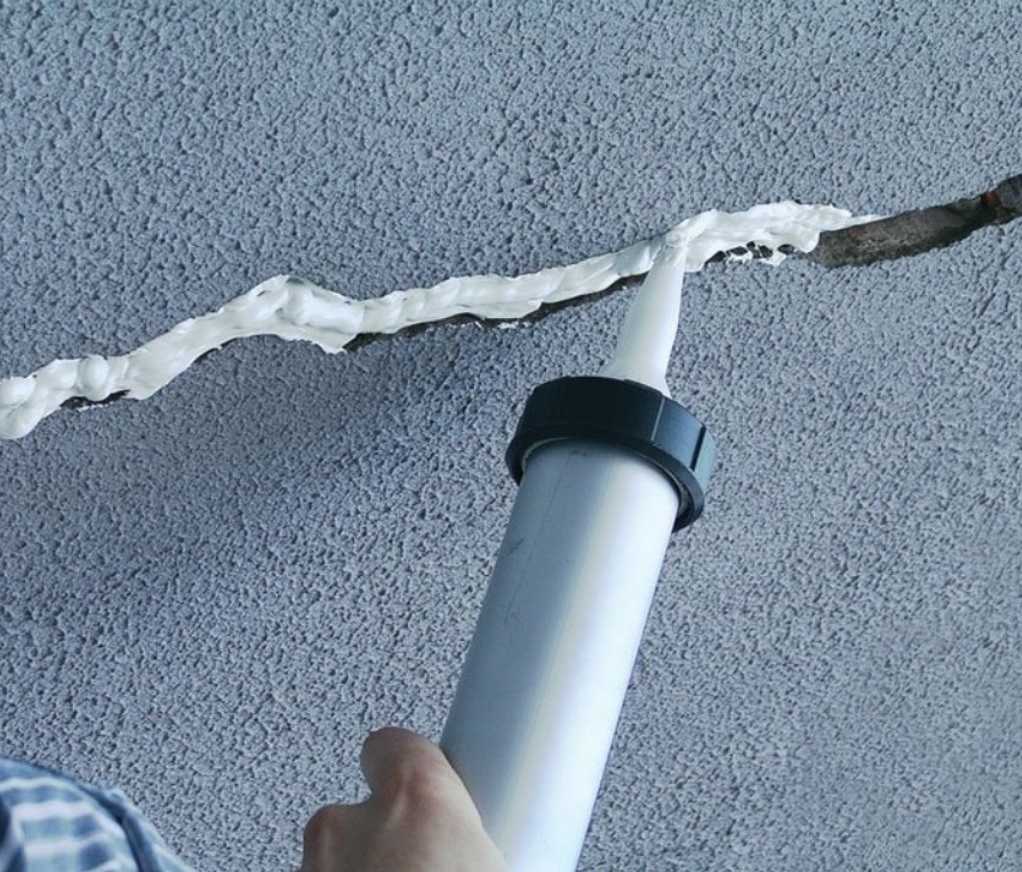 Заделка трещин. Трещины заделываются после их грунтования на всю глубину и высыхания грунтовки. Межплитные щели заполняют монтажной пеной или законопачивают уплотнительными валиками – оставив 1-1,5 см до наружной кромки. Излишки отвердевшей пены тоже подрезают с тем же расчётом – не заподлицо плите, а формируя по шву борозду той же глубины – 1-1,5 см. После подрезки пены боковины плит зачищаются жёсткой стальной щёткой от остатков герметика и грунтуются.Все подготовленные к заделке трещины заполняются раствором какой-либо смеси на основе цемента (штукатуркой, шпаклёвкой, плиточным клеем) заподлицо слою старой штукатурки.