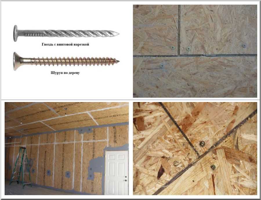 Допускается крепить ОСП непосредственно на стену. Для этого в вырезанном в размер листе высверливают отверстия, устанавливают лист на место, перфоратором бурят стену в намеченных местах, вставляют дюбели и закручивают саморезы. При креплении на деревянное основание метизы закручивают без предварительного сверления.