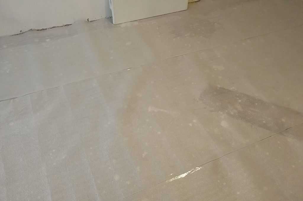 Допустим, защитная черная пленка 0,2 мм настелена с нахлестом на стены, друг на друга и тщательно проклеена широким канцелярским скотчем, образуя формой корыто. Конечно, все зазоры и щелки бы перекрыть не удалось — они находятся возле труб отопления, в дверных проемах, полиэтилен могут порвать мелкие камушки. Поэтому, будем считать, что полиэтилен только задержит на некоторое время проникновение воды в стяжку и далее, к соседям вниз.