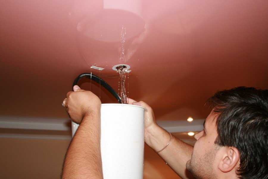 При самостоятельном устранении проблемы в первую очередь нужно аккуратно слить воду. Для этого понадобится частично демонтировать потолок, чтобы жидкость могла стечь, а полотно осталось невредимым. Стоит использовать всевозможные приспособления в виде импровизированных желобов и каналов.
