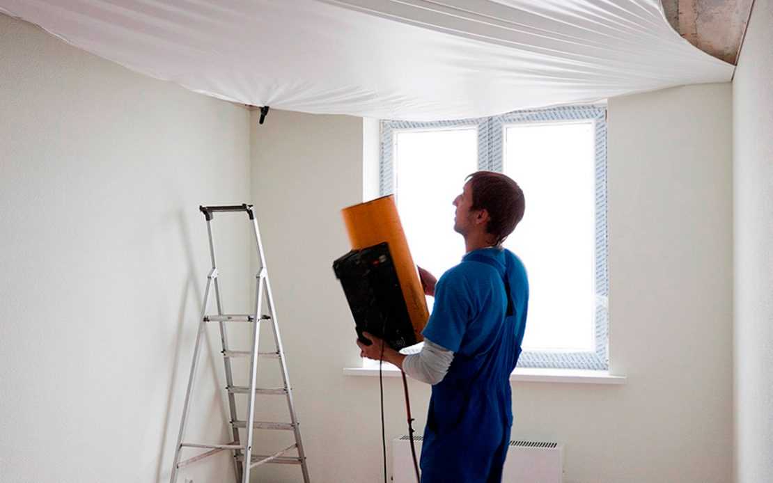 - Затем полотно подвешивают в углах комнаты на зажимах-держателях и включают тепловую пушку. ПВХ пленку разогревают до 70°С, после чего она хорошо тянется.