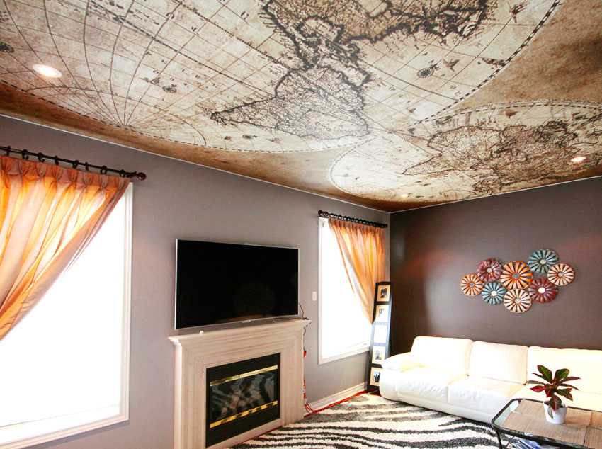 Прежде чем заклеить натяжной потолок своими руками, как вариант, можно выполнить эскиз узора или орнамента на куске ткани и закрыть поврежденный участок полотна.