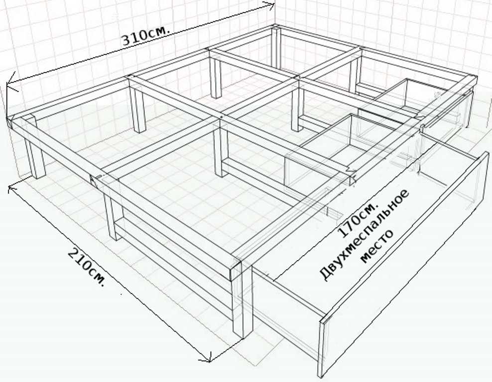 Начало работ также будет связано с проектированием конструкции. На чертеже должны быть отражены габариты каркаса, изголовья, величина бортиков фиксирующих матрас, количество и месторасположение ящиков, и естественно, все имеющиеся размерные пропорции. Для расчёта прочности – максимальная нагрузка на перекрытия не должна быть более 750 кг/м2.