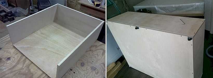 Шаг 5. Из листов фанеры посредством уголков собираются два выдвижных ящика — один, в котором находится спальное место, и второй, куда могут быть сложены подушки, одеяло и другие принадлежности.