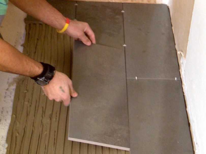 По размеченной линии приступают к укладке кафеля на пол. Начинают с того угла, который первым бросается в глаза.