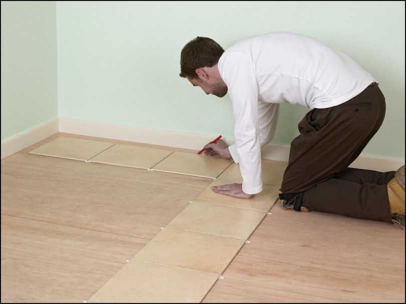 Следующий шаг — это разметка пола под укладку плитки. Первой отмечается линия начала, то есть первый ряд плитки.