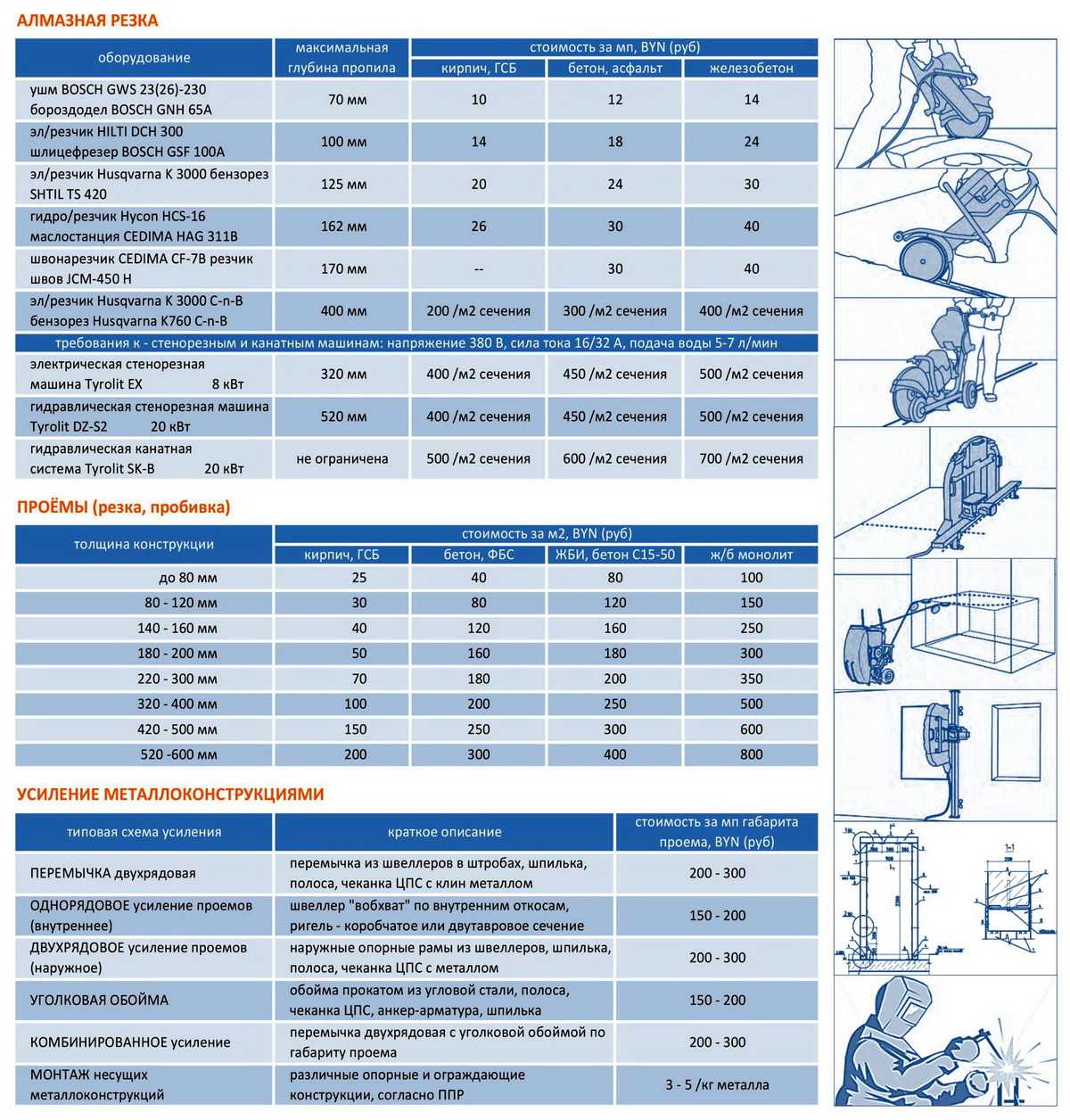— резка, устройство проемов, ниш, отверстий в несущих стенах и перегородках (железобетонные панели, монолитный железобетон, кирпичные конструкции, бетонные и бутобетонные фундаменты, перегородки из газосиликата, пенобетона, керамзитобетона, гипсолита и пр., фундаментные блоки ФБС и т.д.) — проемы, люки в железобетонных перекрытиях, ниши и отверстия в различных конструкциях. — монтаж предварительного или последующего усиления, укрепление металлоконструкциями, восстановление несущей способности конструкций. Металлические перемычки, стальные обоймы, опорные рамы, колонны, ригеля, балки и пр.