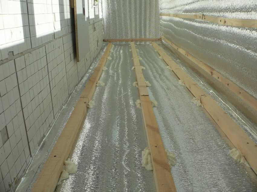 Далее используется слой изолар — это металлизированная подложка, которая отражает тепло и защищает от влаги, широко используется при создании теплого балкона (лоджии). После укладки всех слоев стройматериалов мы достигли одинакового с комнатой уровня пола без порогов и ступенек.