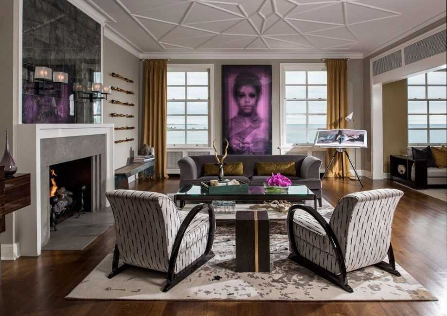 Стилю присуще необычное сочетание цветов, фактур и геометрических элементов. Интерьер выглядит смело и свежо. Двухуровневый потолок поможет создать интересные переходы и цветовые сочетания, которые подчеркнут необычное дизайнерское решение.