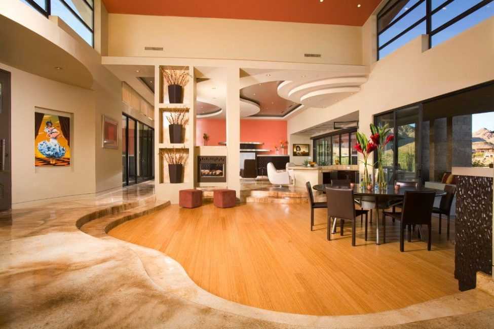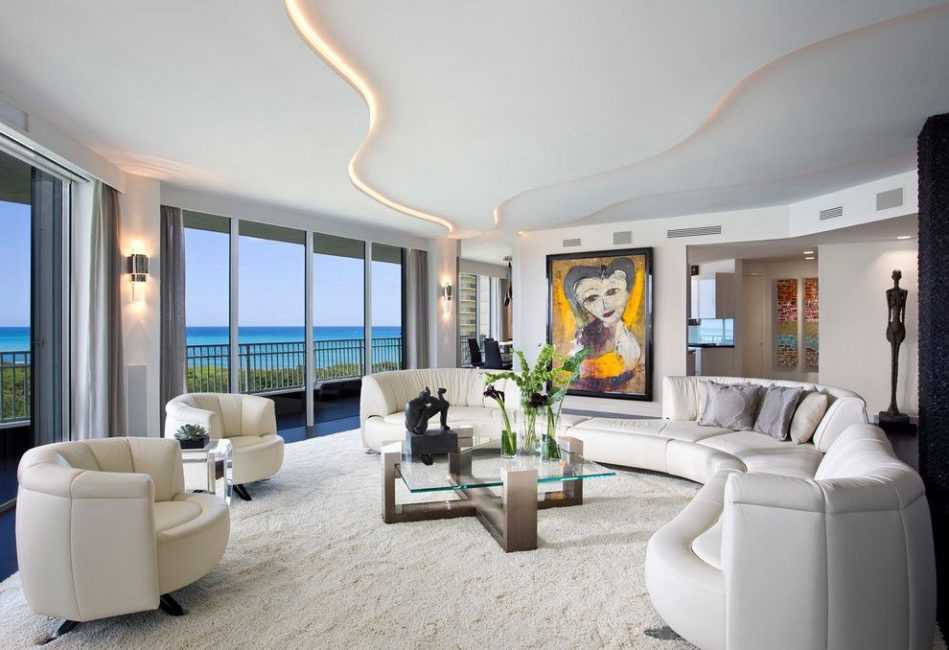 криволинейные – фигуры всех уровней могут иметь как простую, так и сложную форму, но с изогнутыми сторонами, закругленными углами и прочим. Такой вариант выступает еще более эффективным дизайнерским инструментом: асимметричная криволинейная фигура позволяет учесть не только конфигурацию комнаты, но и способ зонирования и размещение мебели;