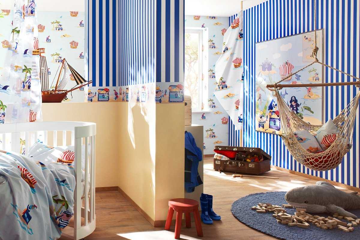 При рождении пространство мальчика можно оклеить обоями в бежевых, бирюзовых, пастельно-желтых тона. Без « кричащих» рисунков. Создать спокойный интерьер. Позже, когда ребенок немного подрастет, можно стилизовать его часть комнаты под космический корабль, кабину машины. Мальчики это точено оценят. Когда ребенок пойдет в школу акцент в интерьере можно сделать на спорт, подобрать обои с соответствующей тематикой. Постараться оформить интерьер так, чтобы в последствии, убрав некоторые детали, комната из детской легко превратилась в подростковую. Это можно сделать, заменив текстиль, не трогая обои.
