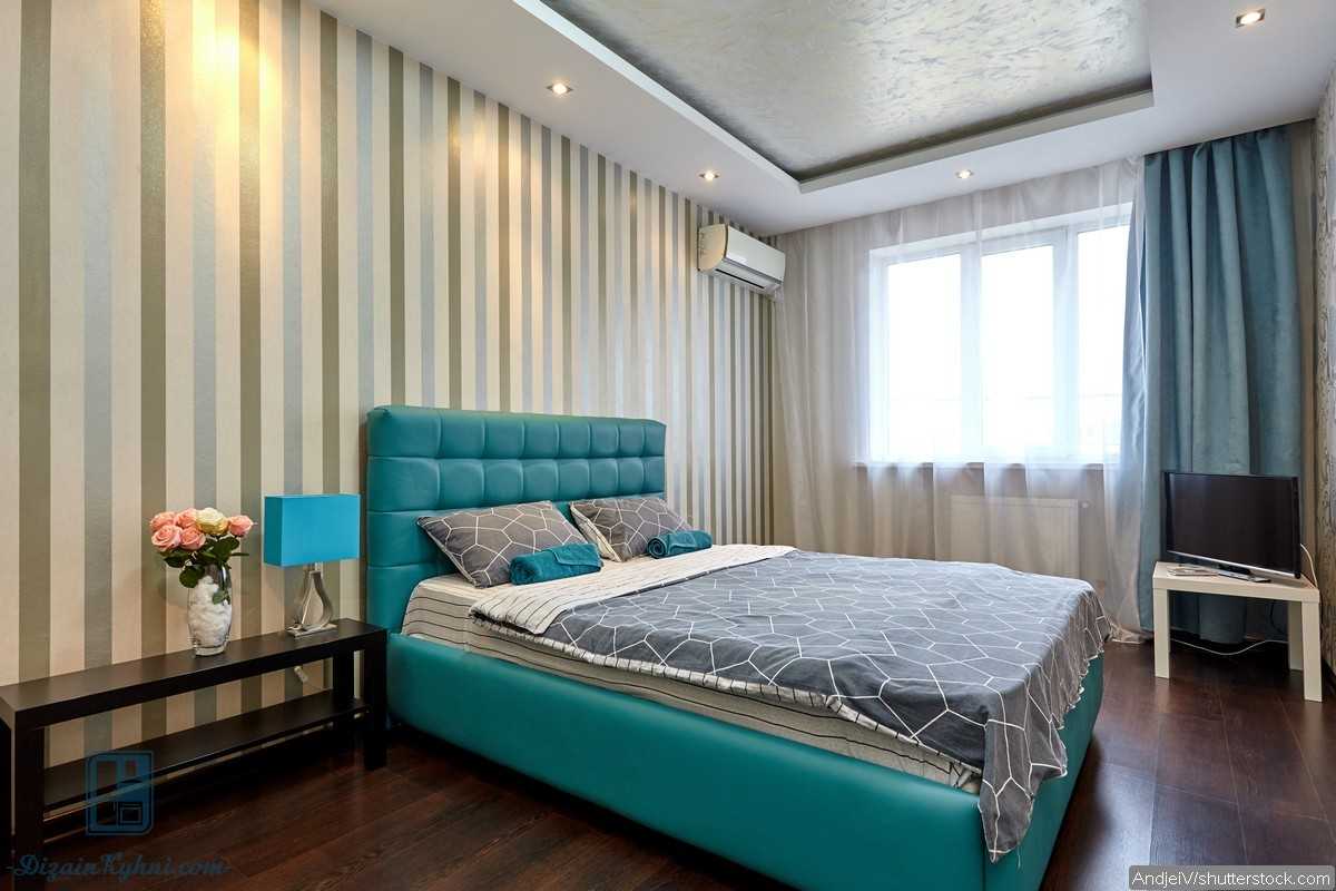 Вертикальные полосы на обоях визуально увеличивают высоту потолка, даже если они повторяются нерегулярно. Можно добавить изюминку в дизайн вашей спальни – одна стена – в полоску, остальные – однотонные или с не очень броским рисунком.