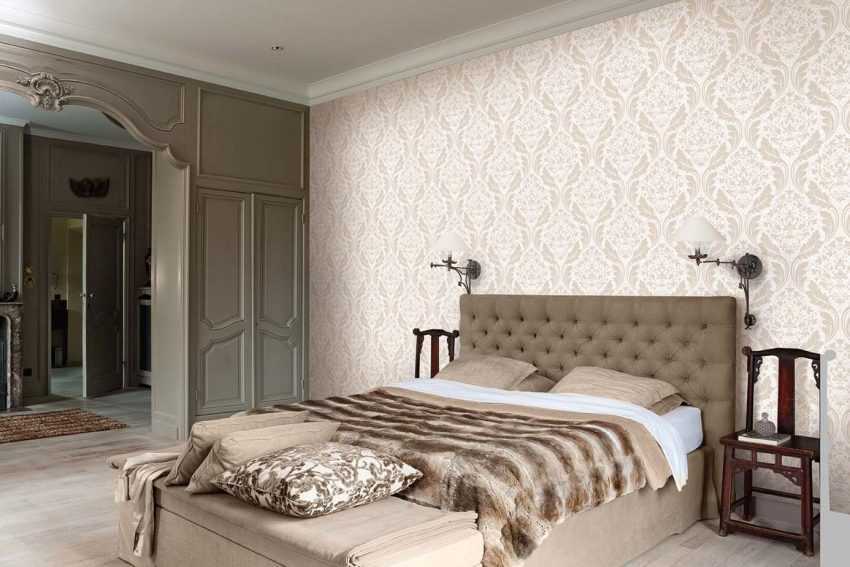 Классические обои для спальни представлены узорами «дамаск», плавными орнаментами, вензелями и растительными композициями.