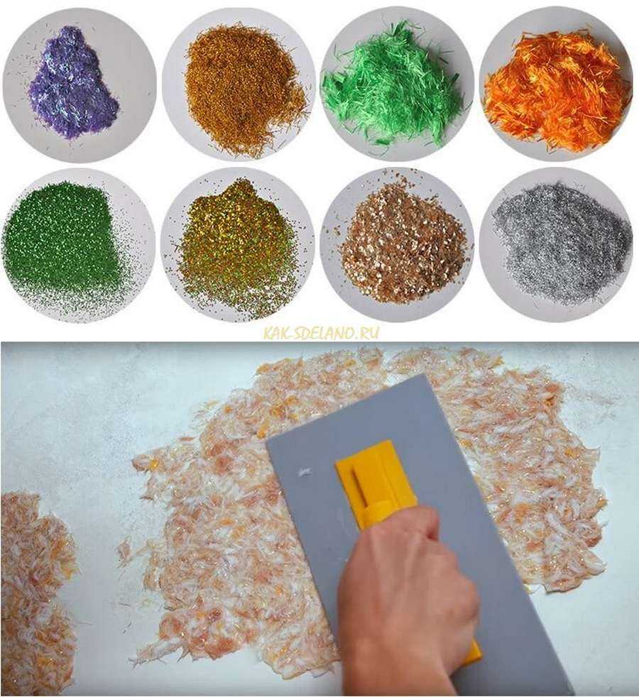 Разные виды жидких обоев с глиттерами разного типа