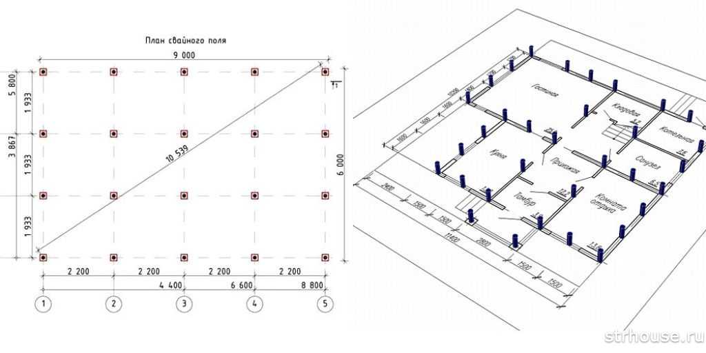 Первыми на плане свайного поля располагают угловые сваи и сваи под пересечениями несущих стен. Далее равномерно с выбранным шагом распределяют остальные сваи. На последнем этапе планируются сваи под входные группы и пристройки, а также под тяжелые элементы в виде каминов и печей.
