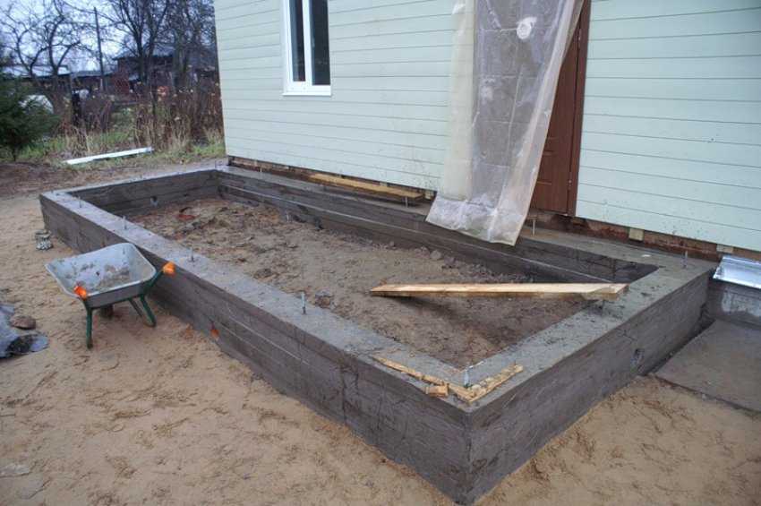 Башмаки отливают в грунте или в опалубке. Устанавливать новую основу под веранду нужно поочередно с башмаками: с наружной и внутренней стороны веранды.