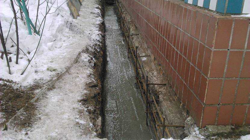 - Для этого придется по длине фундамента откапать траншею с глубиною, равной глубине фундаментной ленты, шириною, чтобы внутри можно было бы проводить работы.