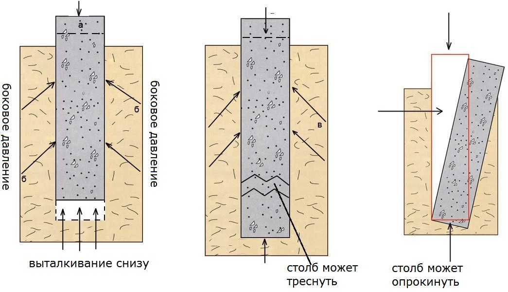 Силы пучения прикладываются как снизу, пытаясь вытолкнуть столб, так и с боков, пытаясь сдвинуть опору в сторону. Именно по этой причине в глинистых — пучинистых — грунтах лучше делать столбы монолитными с армированием.