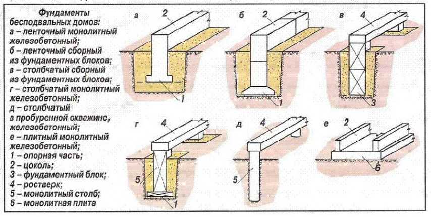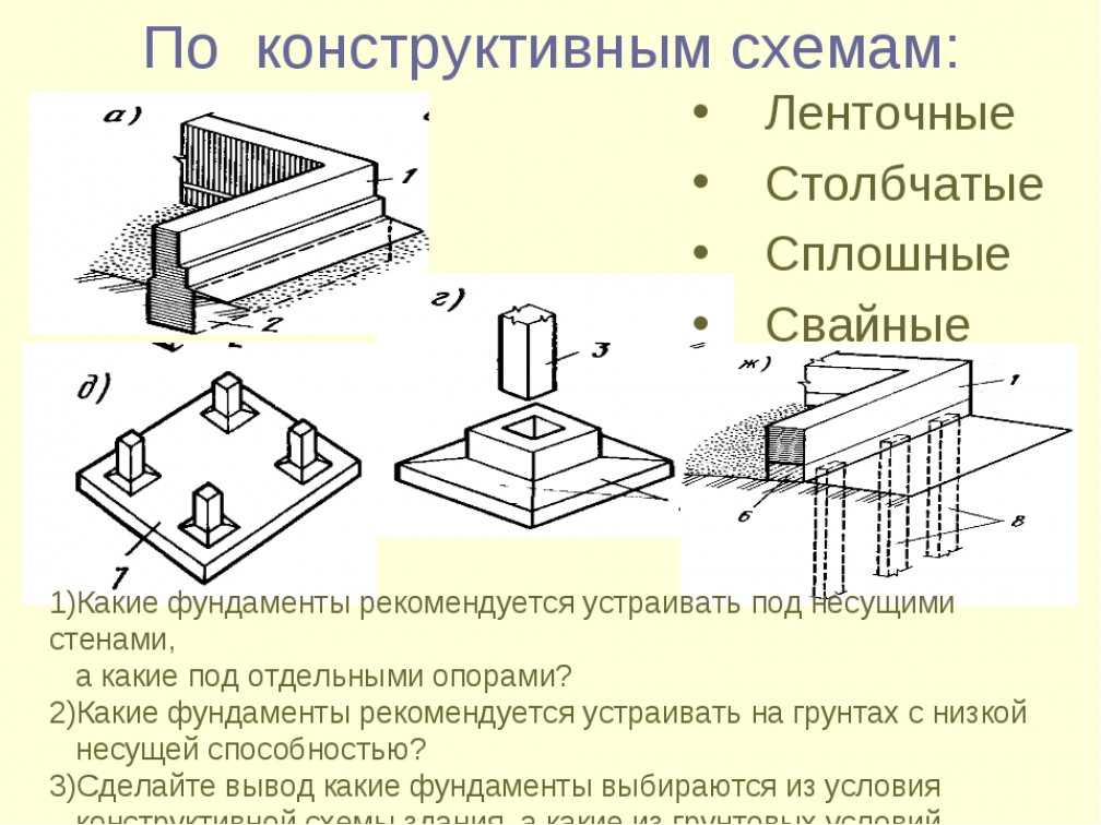 - конструктивных решений (конструктивных особенностей подземной части сооружения: наличие или отсутствие подвала; отдельные фундаменты под колонны, ленточные под стены или сплошная монолитная плита под всё сооружение; монолитные или сборные фундаменты и пр.);