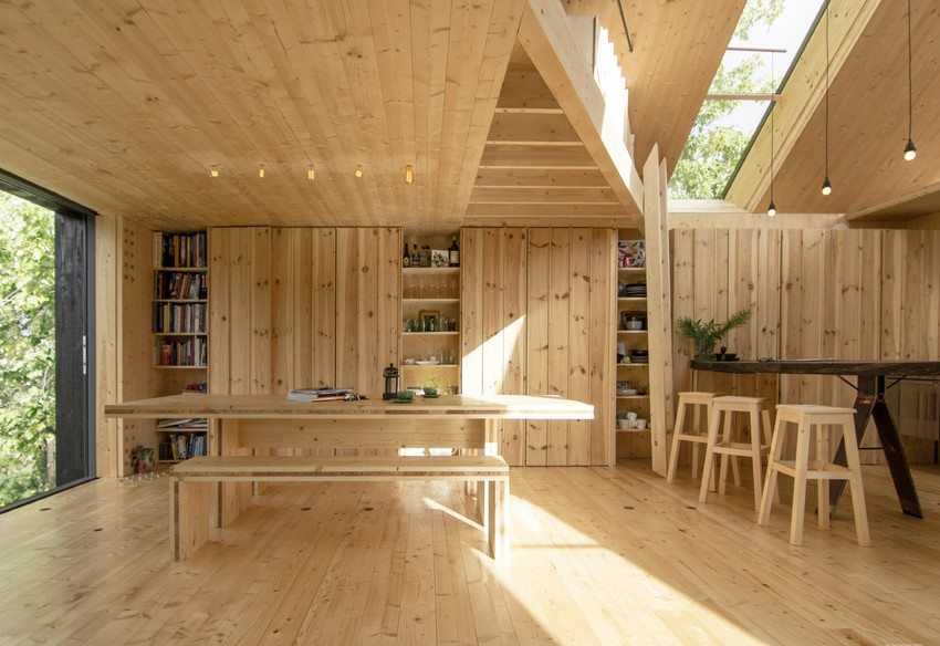 В оформлении дома использована натуральная древесина и современные отделочные материалы