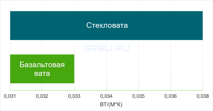 Ввиду волокнистой структуры передача тепла через минеральную вату зависит от толщины нитей. Стекловата с волокнами 5-15 мкм имеет показатель теплопроводности 0,038-0,046 Вт/(м*К). А базальтовая вата, с волокнами сечением 3-5 мкм начинает свое минимальное значение от 0,033 Вт/(м*К). Поскольку у утеплителя из базальтовой основы нити тоньше, то передача тепла по ним занимает больше времени, что делает его лидером в этой характеристике.