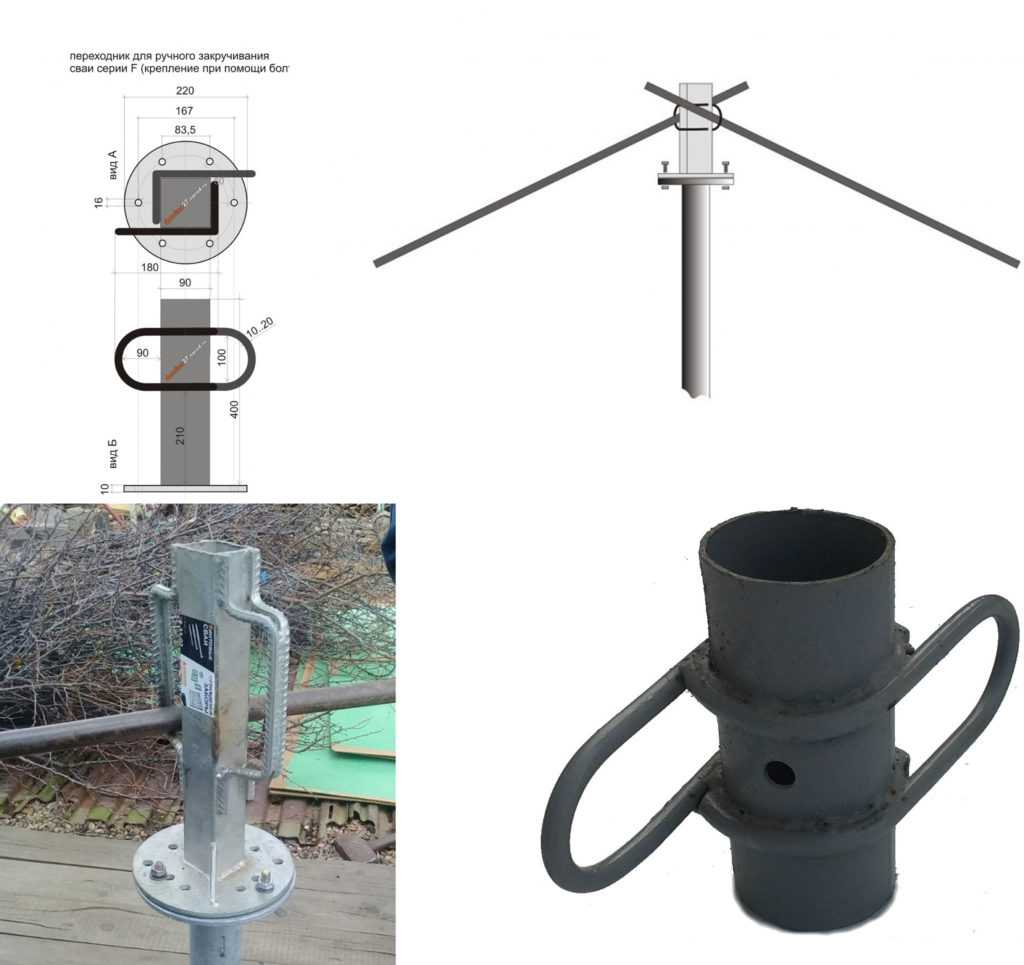 Для этого понадобится приспособление, состоящее из отрезка трубы. Оно должно быть немного больше по диаметру, чем сечение ввинчиваемой опоры. В этой трубе должны быть предусмотрены отверстия для соединения с винтовой конструкцией болтами и две проушины под установку рычагов.