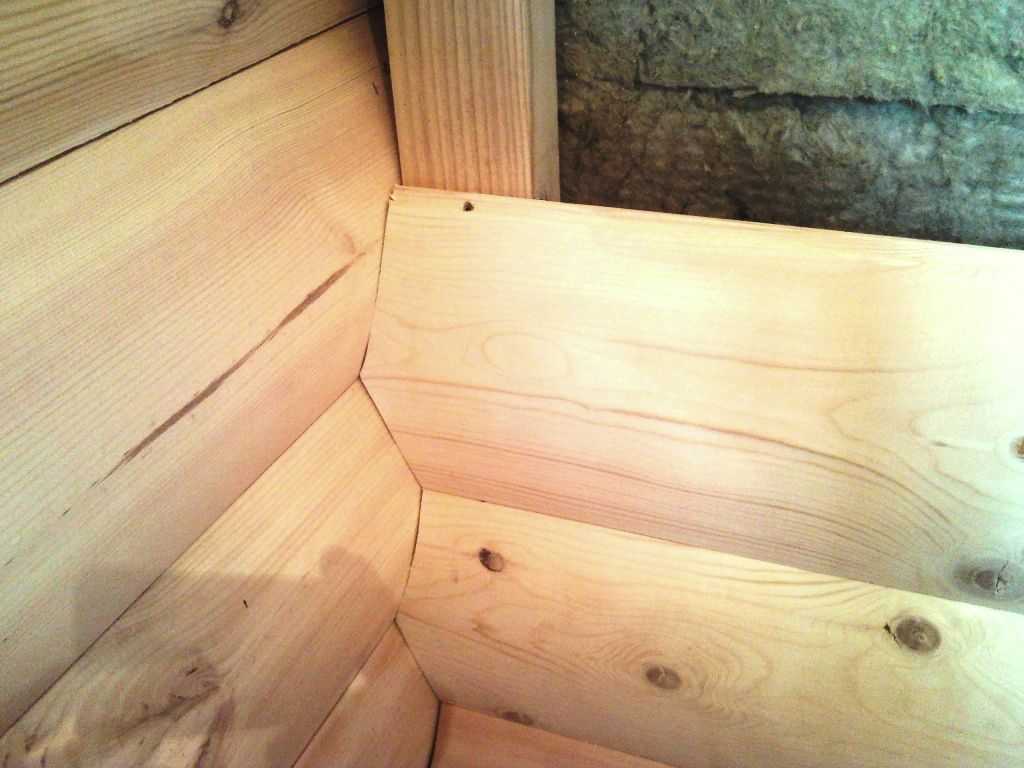 - Следующий этап отделки дома блок хаусом – обработка зазоров: здесь выбирают или шпатлёвку, или же устанавливаются деревянные шканты (крепятся на клей). Излишки шканта просто обрезают, края – шлифуют.