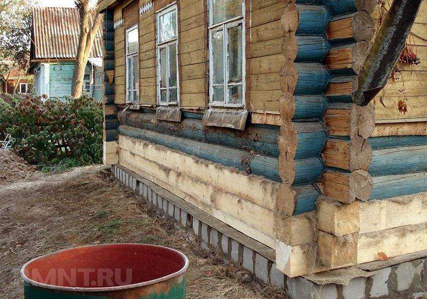 Второй способ заключается в получении доступа к дефектной зоне через демонтированный фундамент. Ограничением являются случаи, когда здание стоит на блочном или монолитном железобетонном основании. После удаления верхнего слоя фундамента проводится смена венцов.