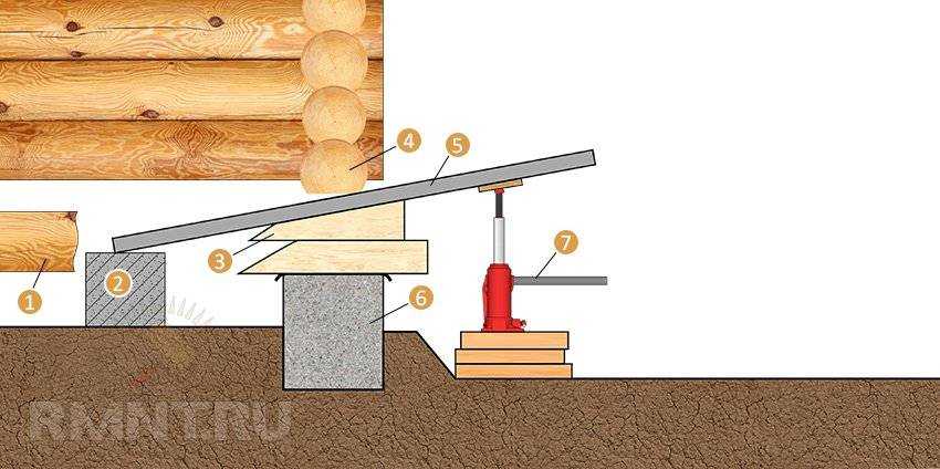 1 — нижнее бревно венца; 2 — опора рычага; 3 — деревянные клинья; 4 — верхнее бревно венца; 5 — рычаг (швеллер); 6 — ленточный фундамент; 7 — домкрат